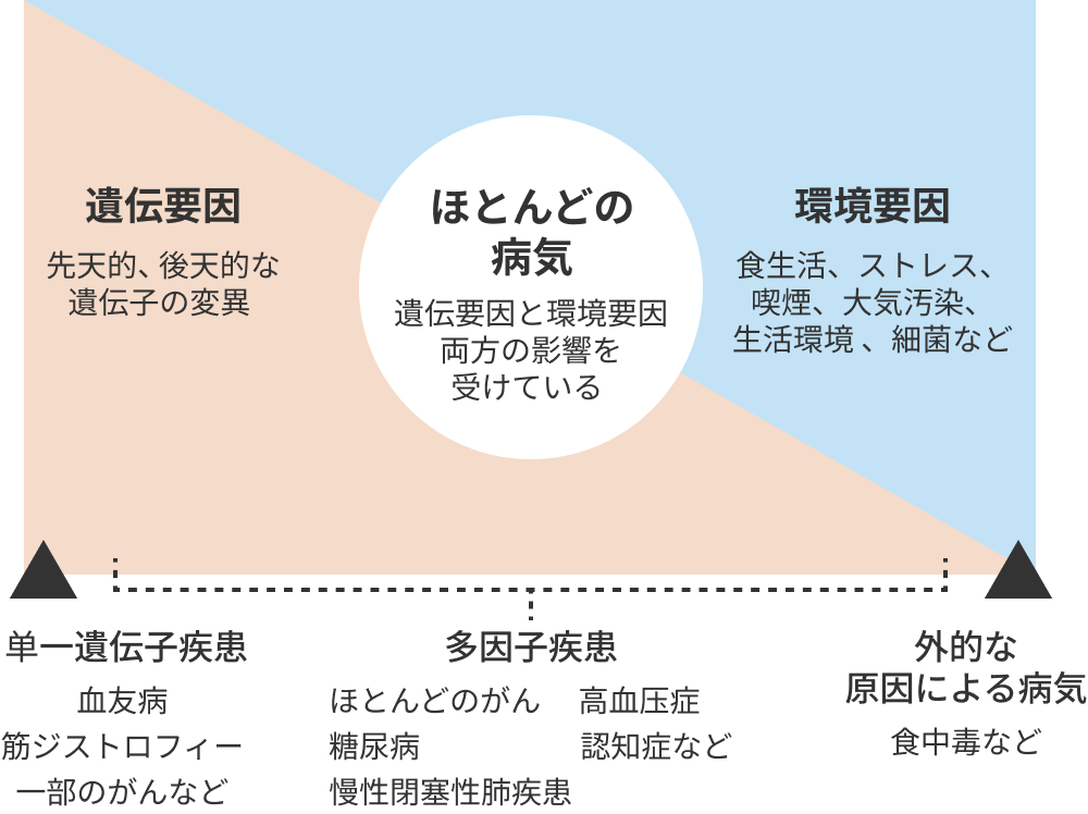 遺伝子の違いによっては、病気になりやすい体質を作ってしまうこともあります。これを「遺伝要因」といいます。一つの遺伝子にわずかな違いがあるだけで病気を引き起こすことがあります。こうした病気を「単一遺伝子疾患」といいます。一方、複数の遺伝子が関係していて、さらに生活の仕方などの「環境要因」も加わって起こる病気を「多因子疾患」と呼んでいます。糖尿病、高血圧など、私たちの身近にある病気の大部分は多因子疾患です。