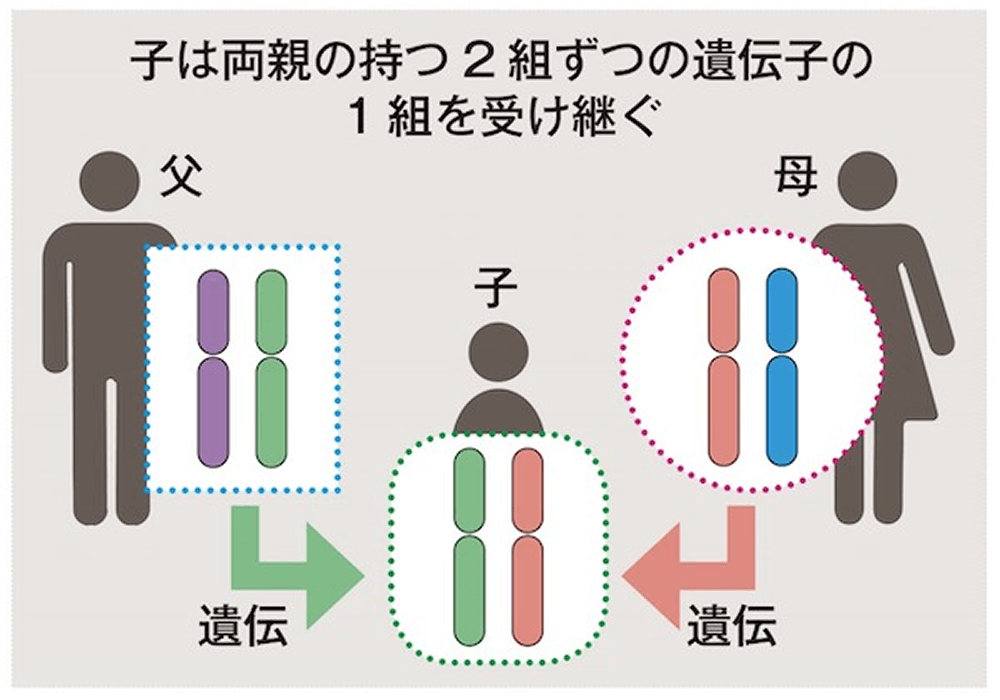 多くの遺伝子は一対になっており、下の図のように、両親からひとつずつ受け継がれます。単一遺伝子疾患では、一対のうち片方だけに変化があっても発症してしまう病気や、一対の両方が変化してしまうと病気になるタイプなどがあります。これらの場合、家族の間で伝わる可能性が高いということになります。また、両親の精子や卵子ができたときに、DNAの配列に変化が起こって病気になることもあります。これを突然変異といい、家族に病気の人がいなくても、単一遺伝子疾患になることがあるのです。